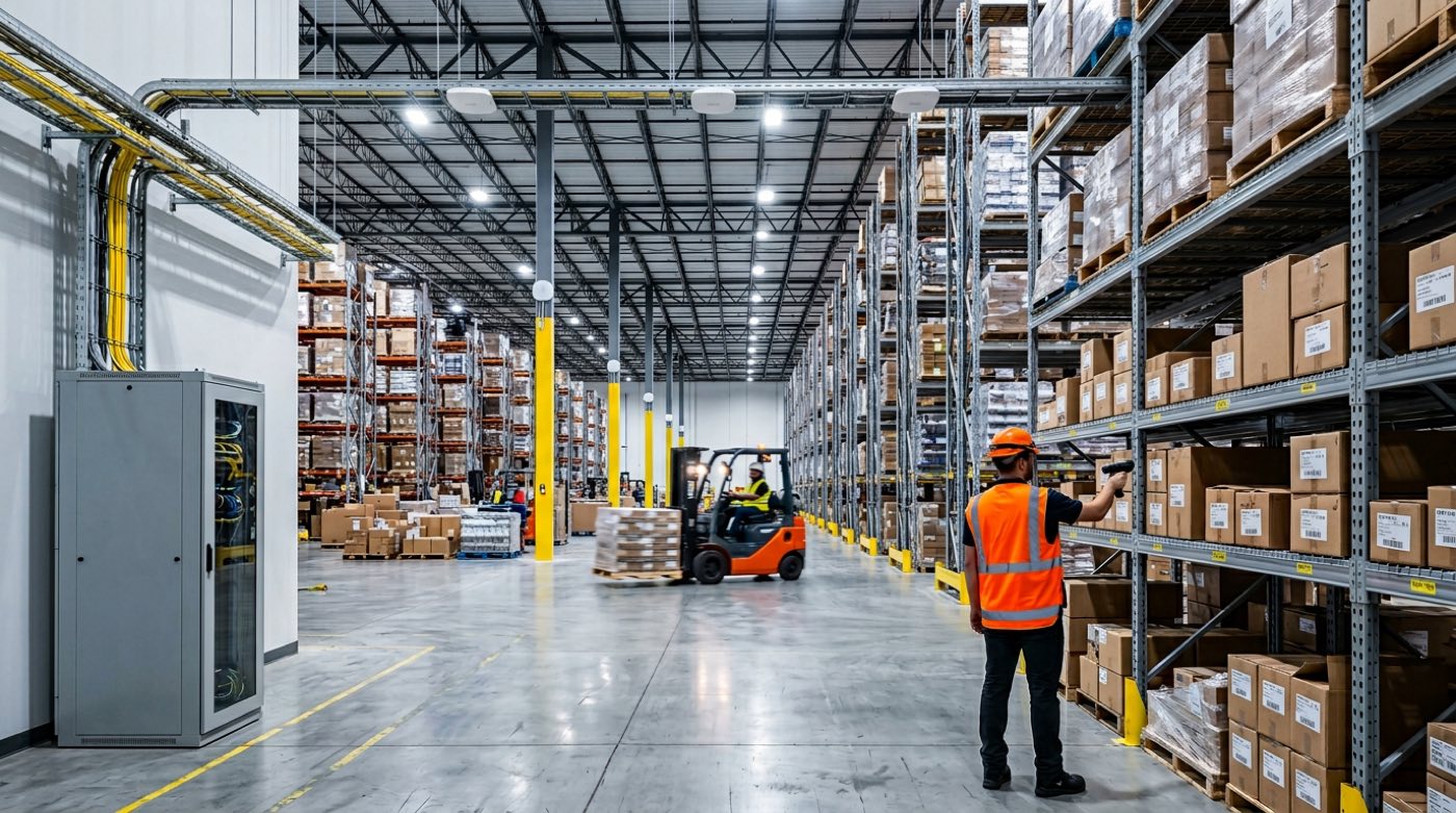 Your operation runs on the LAN and Wi‑Fi under it: main distribution frame and intermediate distribution frames, structured cabling, switch capacity, PoE budgets, and access points distributed through racking zones so handoffs happen before signal dies. We engineer for forklifts moving at speed, handheld scanners at arm’s length, IP cameras, label printers, IoT sensors, and barcode readers — not just laptops in a conference room.