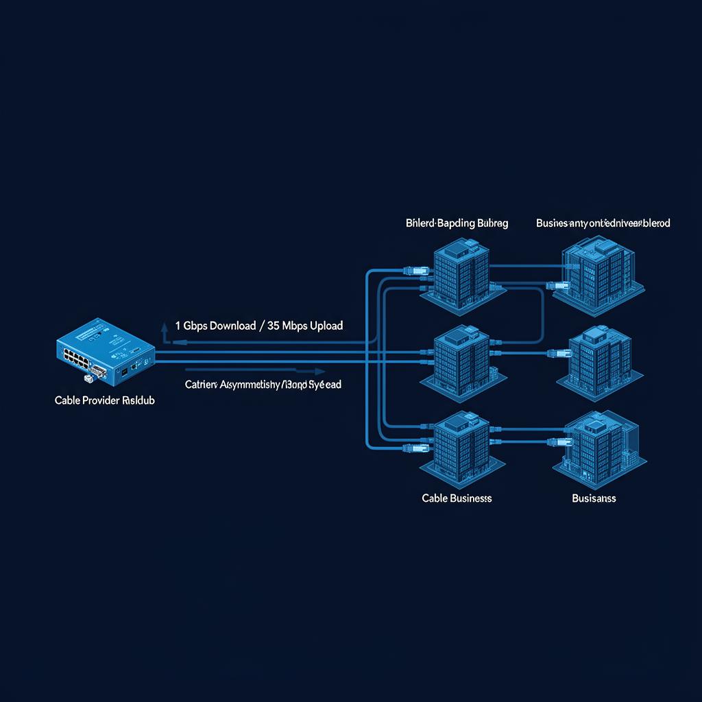 Cable broadband is delivered over coaxial cable using DOCSIS (Data Over Cable Service Interface Specification). A coax line runs from the provider's local node to your building, where a cable modem converts the signal into Ethernet. Because the coax infrastructure was originally designed for television, it allocates more spectrum to download channels than upload. Most business coax services today run on DOCSIS 3.1, supporting downloads up to 1 Gbps but limiting uploads to 35-50 Mbps.